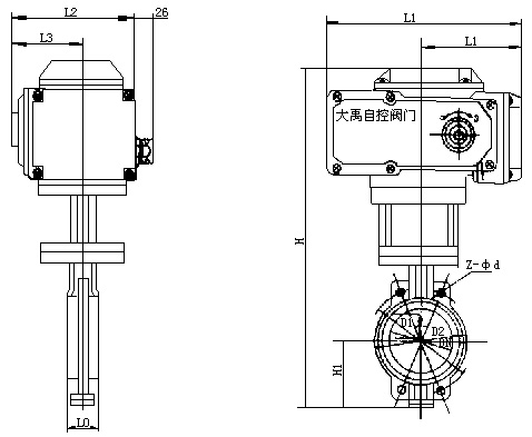 2、ZHJD941电动法兰式蝶阀外形尺寸(注:表中执行器为ulli、DYR)