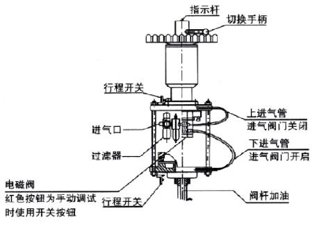 单电控电磁阀:供电时阀门开启或关闭,断电时阀门关闭或打开。 双电控电磁阀:一个线圈通电时阀门开启,另一个线圈通电时阀门关闭,有记忆功能。 回讯器:远距离传阀门开或关位置信号。 气动三联件:减压阀、过滤器、油雾器。对气源稳定、清洁及运动部件起润滑作用。 手动机构:当电路、气路切断或有故障时,用手操作阀门的启闭。 电磁阀、电气定位器、电器转换器、气动定位器回信器等应按相关说明书安装、调试。 安装电磁阀的气动执行器,调试时应先用手动按钮操作(电磁阀上的红色按钮)调试,然后再通电调试。