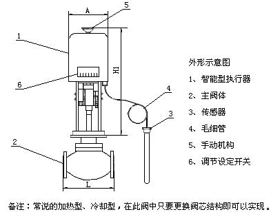 调节阀由主阀、智能执行器与传感器三部分组成,根据用户需要,分别有加热型与冷却型两种结构。